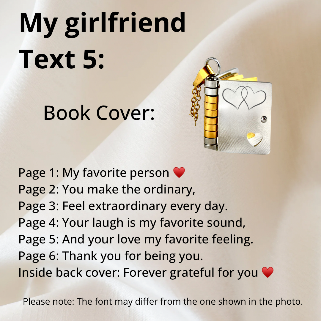 Express your love in a timeless way with our My Girlfriend Book Necklace—this stainless steel pendant is crafted to carry your deepest feelings. Shaped like a miniature book, this unique piece lets you each page with meaningful words, creating a keepsake your girlfriend will treasure forever.